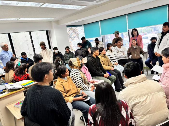 他のクラスの人はいつもあまり話さない人もいるので、日本語でコミュニケーションをとるときのきっかけ作りの練習をしました。Aクラスの半分の学生とBクラスの半分の学生で、2グループをつくって、グループごとに話しました。